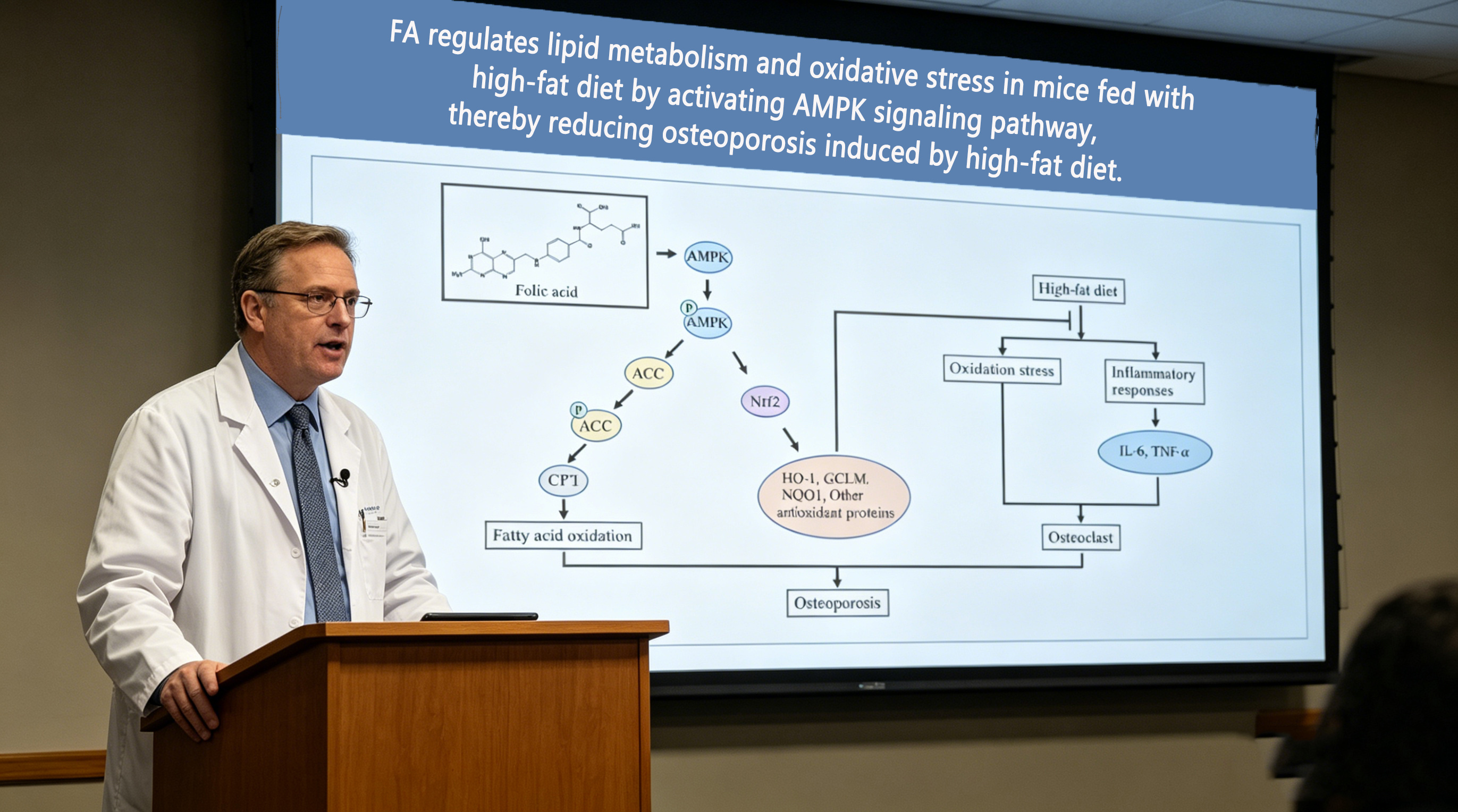 2022 年、*Frontiers in Cell and Developmental Biology* は、*葉酸は AMPK シグナル伝達経路を通じて高脂肪食誘発性骨粗鬆症を軽減する* というタイトルの研究を発表しました。簡単に言えば、高脂肪食は骨を弱体化させますが、葉酸はAMPK経路を介してこのプロセスを軽減します。